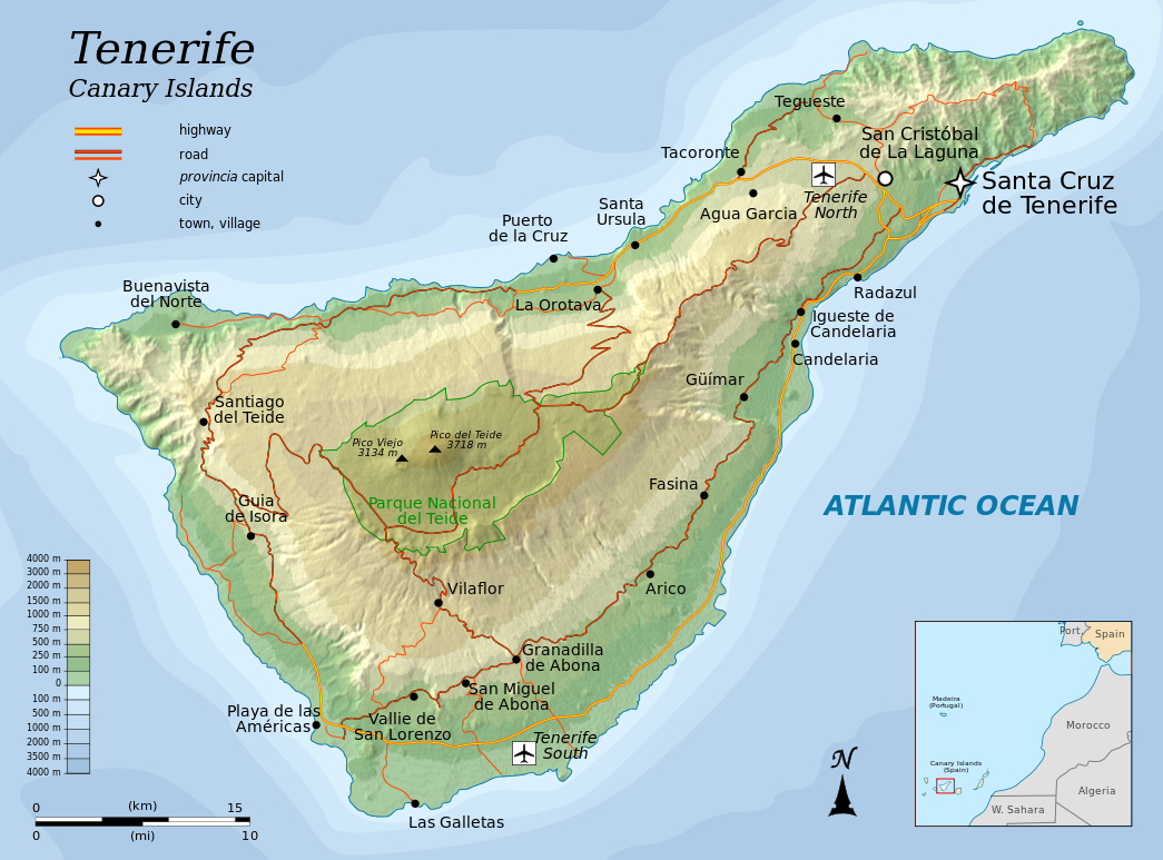 De top van vulkaan El Teide is met 3718 meter het hoogste punt van heel Spanje. Hoewel deze vulkaan officieel slapend is sluiten experts niet uit dat het tot nieuwe uitbarstingen kan komen. Een hele belevenis is om op de Teide naar boven te gaan. Met de kabellift kun je tot een hoogte komen van 3550 meter (mits de lift vanwege harde wind niet gesloten is), wie tot de krater wil komen op een hoogte van 3718 meter heeft daarvoor een speciale vergunning nodig die je vooraf dient te regelen. |